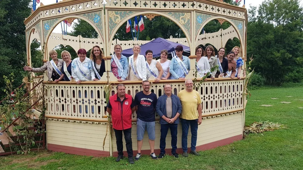 Les anciennes Miss, heureuses de se retrouver, posent au kiosque avec Didier, Cédric, Jean-Noël et Maurice, qui ont contribué au remontage de cet édifice de 1900. © Le Maine Libre