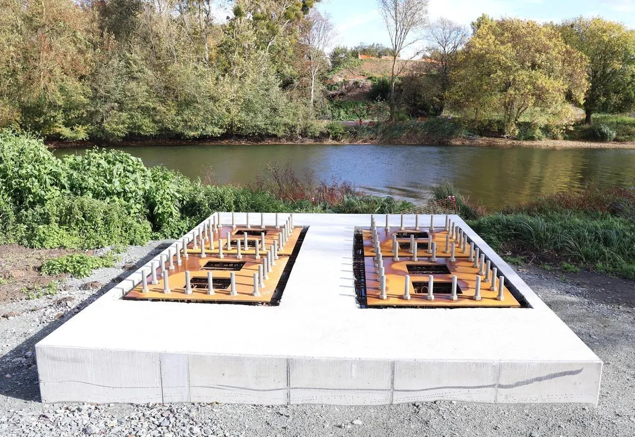 L’entreprise Bouygues, notamment par l’intermédiaire de sa filiale locale CLMTP, s’est d’abord chargée du terrassement et des fondations. La passerelle reposera sur des piliers à quatre branches, positionnés de chaque côté de la rive et hors de l’eau, pour ne pas gêner la navigation. Les dalles sont déjà visibles.