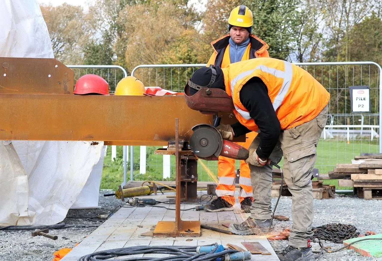 Les ouvriers du chantier à l’œuvre sur l’armature de la future passerelle. Ouest-France