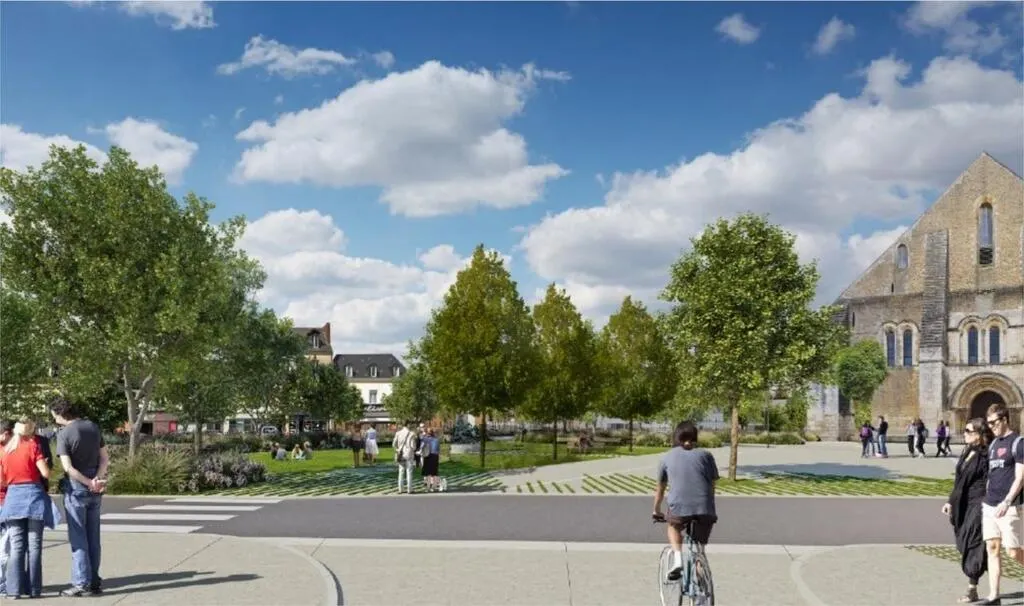 Place de l’Éperon, les places de stationnement disparaîtront avec les chronolignes. La place sera largement végétalisée avec des plantations d’arbres et la création de massifs. © Le Mans métropole