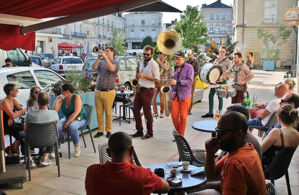 En guise de lancement, le festival s’était pour la première fois exporté dans le centre-ville avec les sessions apéritives de la fanfare angevine Big Joanna sur les terrasses de la place Raphaël-Élizé, vendredi, en fin d’après-midi.