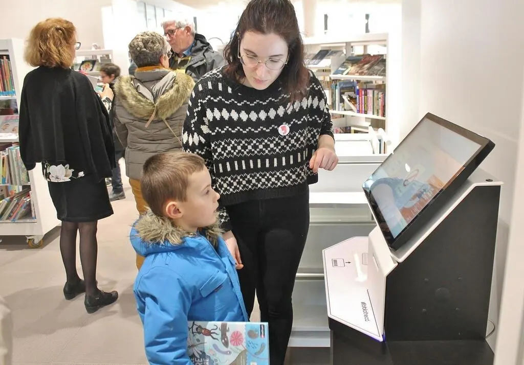 Yanis, 6Â ans, se familiarise avec les nouvelles bornes automatiques pour emprunter et rendre les documents. Ouest-France