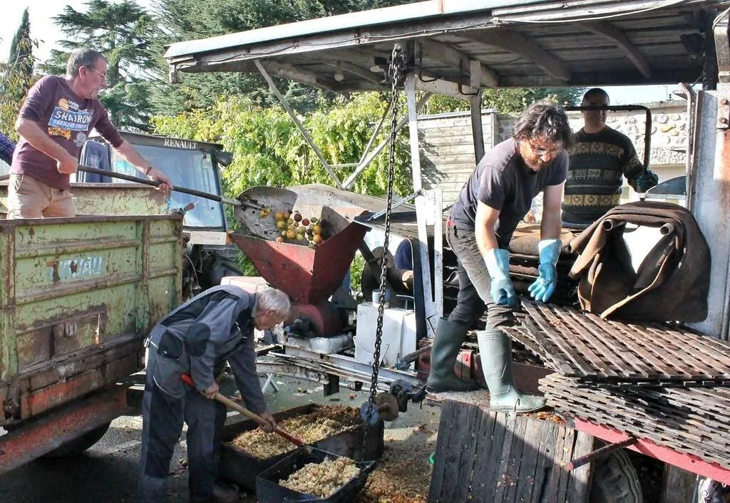 Florian Lemaître (avec les gants, au centre) a fait tourner l’antique cidreuse de son « pépé » avec l’aide de bénévoles. Ouest-France