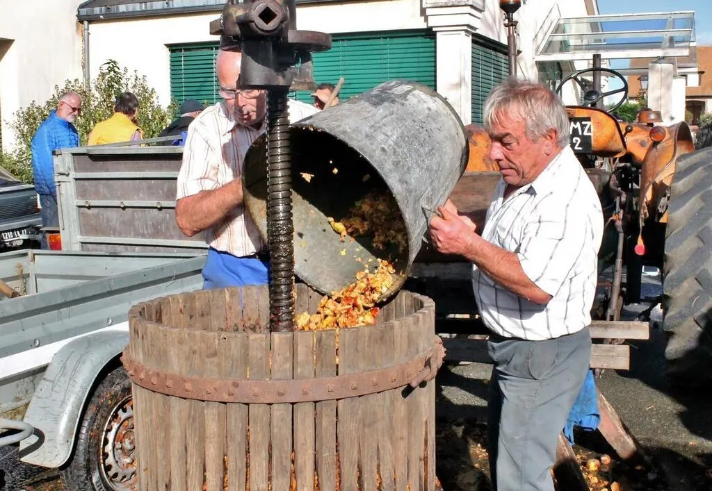 « Mon grand-père l’a eu d’occasion il y a 65 ans et elle marche toujours », sourit le représentant de la famille Peslier, qui perpétue la tradition pendant la saison des pommes, en parallèle de son activité de designer. « À son époque, tous les agriculteurs ou presque faisaient venir ce genre d’engins pour fabriquer leur propre cidre avec leurs pommes », raconte le jeune homme. Marie-Pierre, du haut de ses 69 printemps, confirme : « Ça me rappelle mon jeune temps », rigole-t-elle.