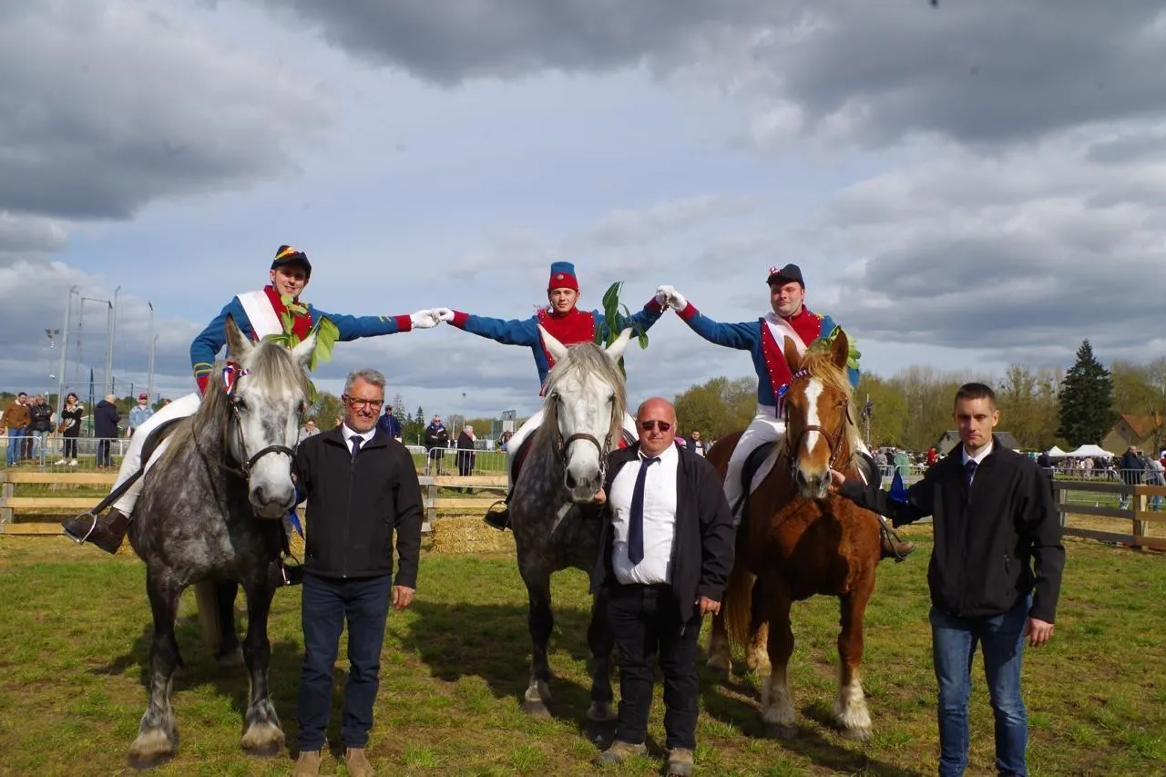 Tom Cosson, 18 ans, vainqueur, félicité par Antonin Métais, le capitaine, Alexis Frumery, le porte-drapeau et les meneurs de chevaux. © Le Maine Libre
