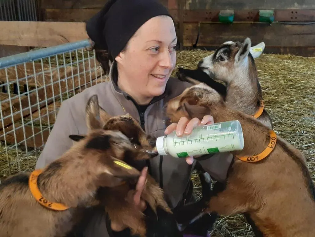 Des chevreaux biberonnés par Élodie, devenue une passionnée des chèvres. © Le Maine Libre