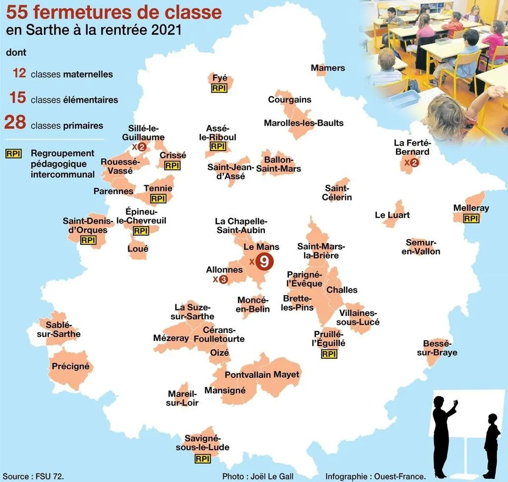 Le syndicat Snuipp-FSU a communiqué la liste des 55 fermetures de classes envisagées à la rentrée de septembre par la Dasen en Sarthe. Dont 38 en milieu rural, 3 à Allonnes et 9 au Mans.