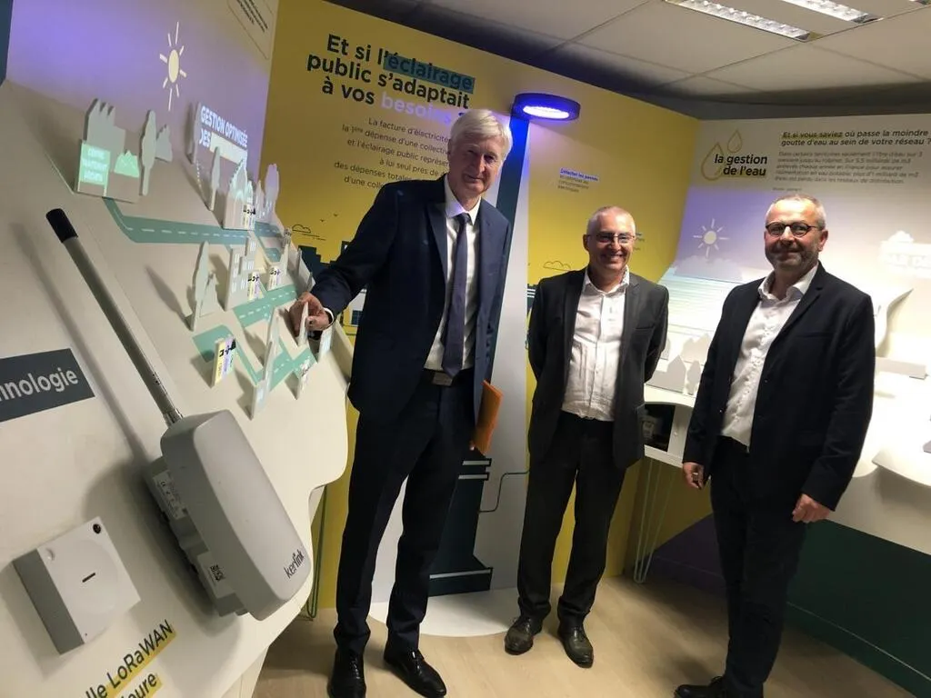 Dominique le Mèner, président du conseil départemental et de Sarthe Numérique ; Rémi Carrière, directeur de Sartel et Nicolas Hecq, directeur technique de Sarthe Numérique, ont inauguré le « showroom », vitrine des diverses applications du LoRaWAN, ce jeudi 28 septembre 2023. © Ouest-France