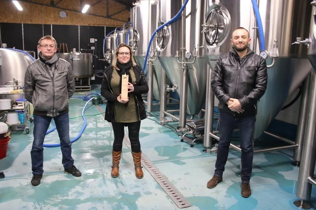 Stéphanie Grouard, trophée en mains, entourée de Cédric à sa gauche et de Franck Royer dans leur microbrasserie Mage Malte à Mamers (Sarthe) © Ouest-France