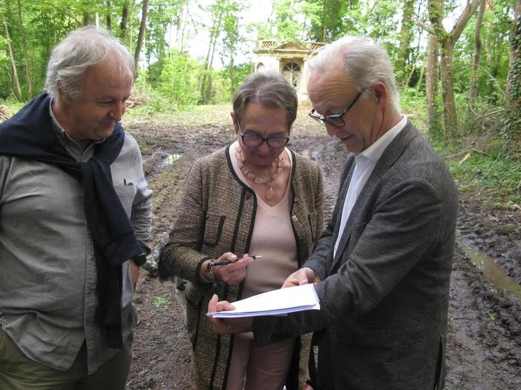 Amaury et Arnaud Roullet de la Bouillerie et Françoise Maillard, déléguée départementale pour la Fondation du patrimoine, ont signé la convention en vue de la restauration de la gloriette du château de la Bouillerie. © Ouest-France