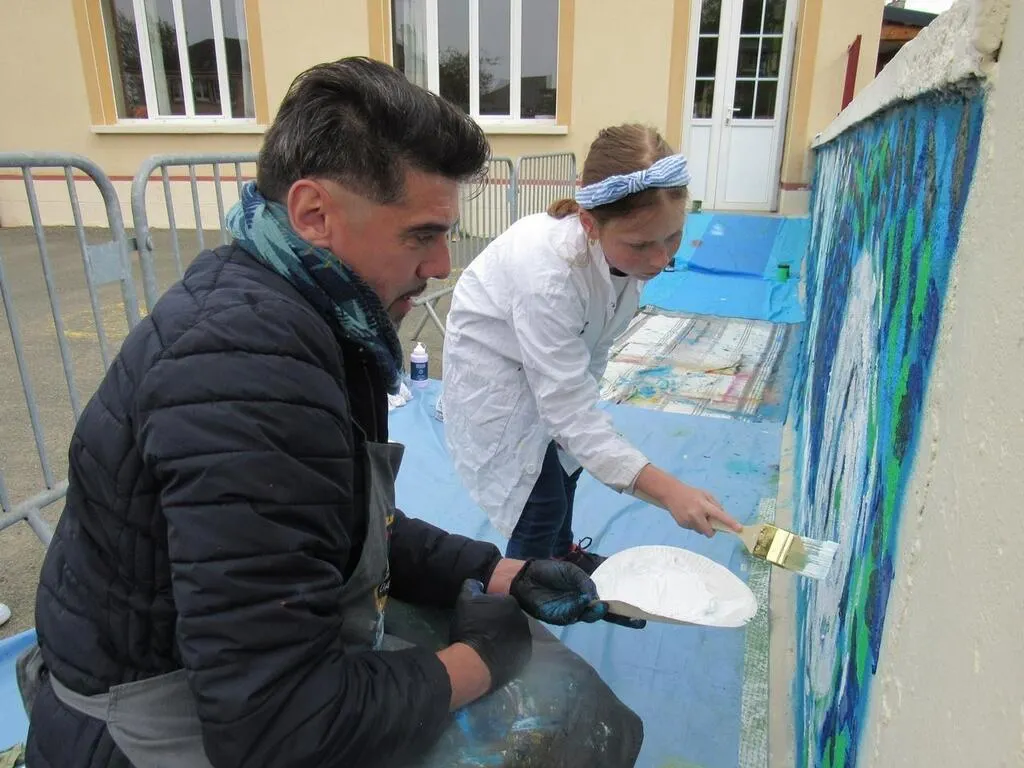Sous sa houlette, les 60 élèves de l’école réalisent une fresque de 40 m de long sur 1,5 m de haut. Un travail permettant l’expression artistique de chacun, mais aussi un travail pédagogique. La fresque devrait être terminée fin mai.