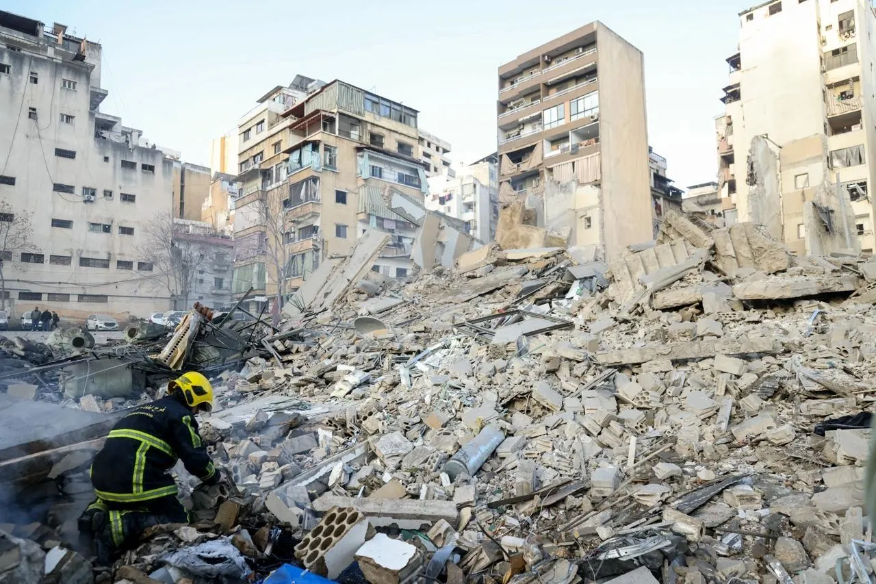 Un pompier examine les débris sur le site d’une frappe aérienne israélienne dans le quartier de Bashoura à Beyrouth, le 18 mars 2026. © IBRAHIM AMRO/AFP