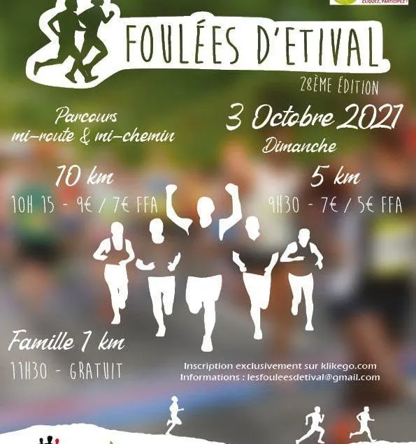 À partir de 9 h, les Foulées d’Étival commenceront avec parcours duo 3,3 km (inscription 5 €) ; 5 km (9 h 30, 7 €) et 10 km (10 h 15, 9 €). La course des familles sur 1 km clôturera la matinée à 11 h 30 (gratuit).