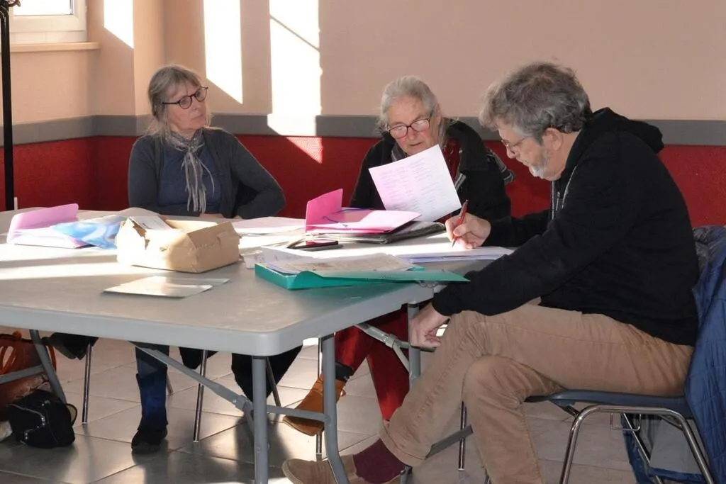 Pascale Bertrand, vice-présidente de sARThelaine, Sarine de Bruin, présidente et Serge Heuzard, secrétaire occasionnel, lors de l’assemblée générale de l’association. © Le Maine Libre