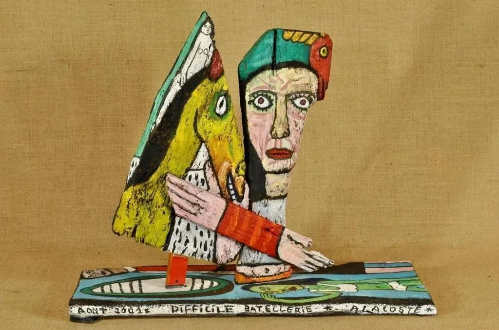 C’est après une rencontre décisive avec un certain Robert Tatin, qu’Alain Lacoste se dédie à un art personnel coloré, impertinent voire provocant, fait d’assemblages grossiers de bric et de broc collés. « C’est un art de la récupération. Des papiers, du tissu, du bois mort, des pierres forment les aplats et les reliefs. Lacoste crée vite. La dynamique habite son œuvre », décrit le collecteur.