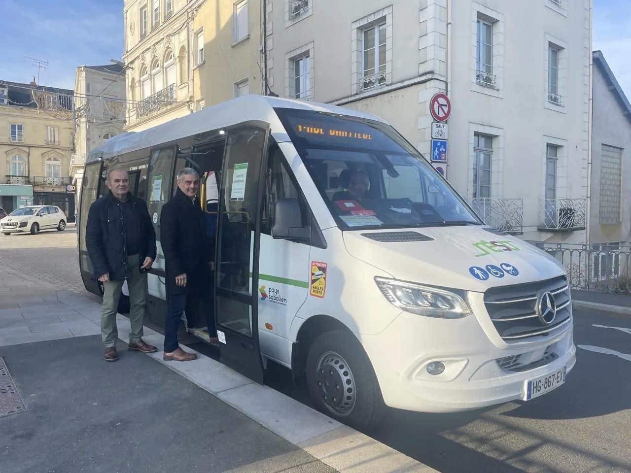 Daniel Chevalier, le président du Pays sabolien, accompagné par Jean-Louis Lemaître, montent dans la toute nouvelle navette gare – entreprises qui entrera en service dès le jeudi 18 décembre 2025. © Ouest-France