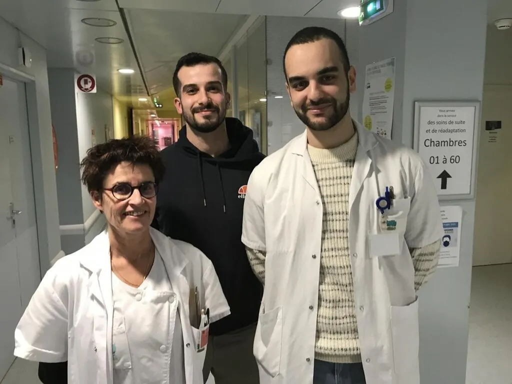 Les médecins algériens Mehdi Challam et Ilyas Cerbah, 27 et 25 ans, ont rejoint l’hôpital du Bailleul fin janvier 2024. Ici, avec la responsable du service de gériatrie le Dr Chalain. © Le Maine Libre