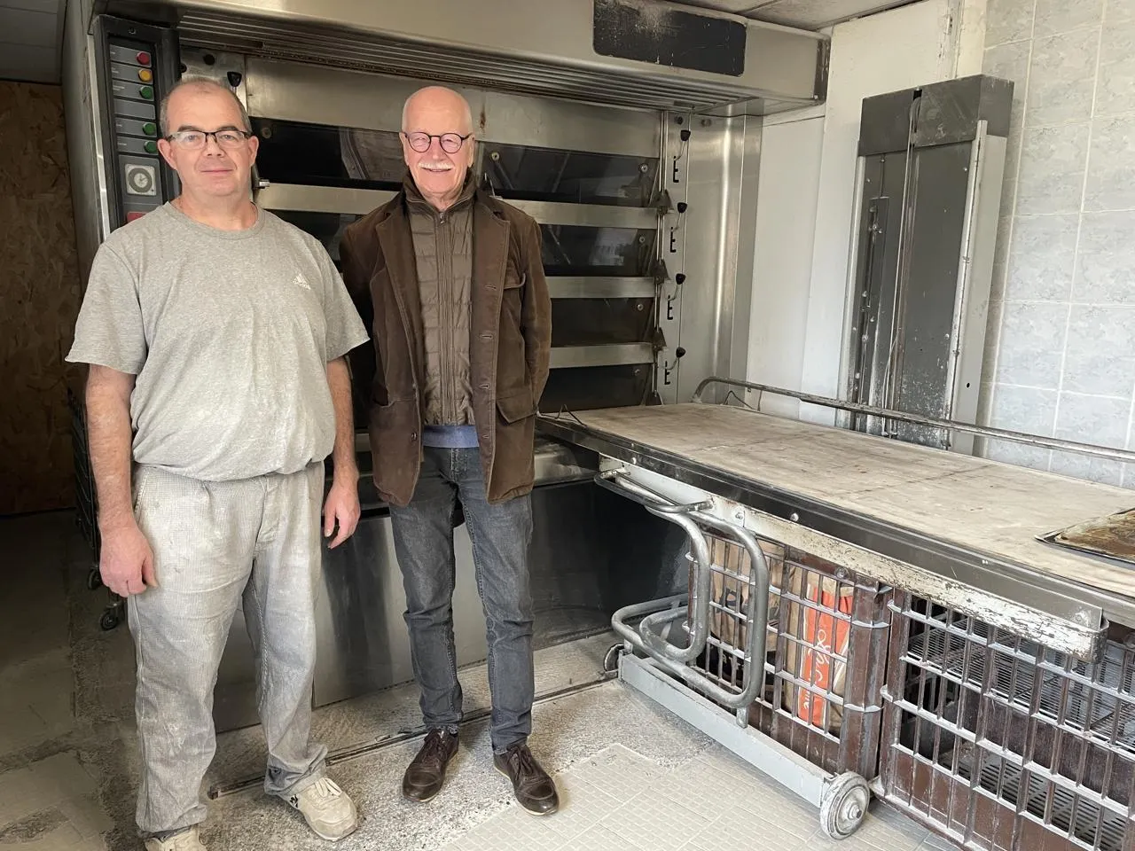 Joël Denis, ici en compagnie de Maurice Duluard, le maire de Poillé-sur-Vègre (Sarthe), a décidé de raccrocher après neuf ans dans le fournil de la boulangerie du village dont les murs appartiennent à la municipalité. © Ouest-France