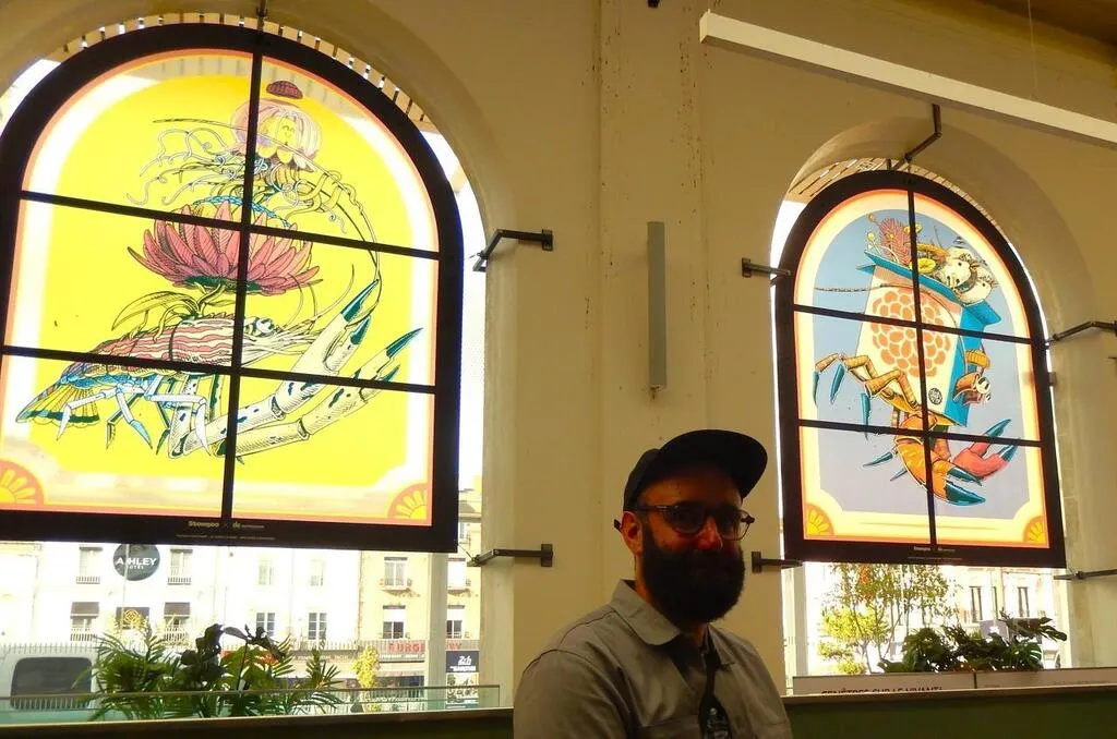 « Les sérigraphies et vitrophanies dessinées par le Street artiste ont été réalisées par DS Impression puis posées sur 4 grandes baies en gare nord et dans la rotonde en gare sud », explique Etienne Kervella, le directeur artistique de Plein Champ.