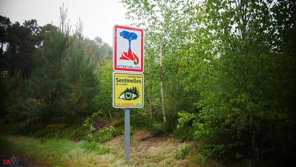 Cinquante panneaux comme celui-ci ont été installés sur le territoire du Pays sabolien pour sensibiliser la population au risque des feux de forêt. © Ouest-France