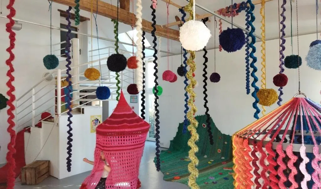 Le centre d’art s’est paré de belles couleurs pour accueillir les petits et les grands rêveurs. À la fois tapis d’éveil, décors suspendus de tourbillons et de pompons, l’exposition de Lili Bel offre un monde magique de structures de laine au crochet. On se déchausse, on explore, on court, on rêve, on peut également lire des livres prêtés par la Bibliothèque associative de Fillé-sur-Sarthe. De nombreux trésors sont dissimulés çà et là et rendent l’art accessible et ludique aux petites mains qui, pour une fois, ont le droit de tout toucher.