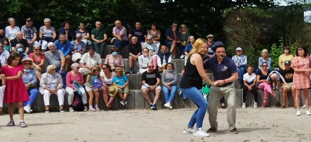 François Giroud et sa partenaire de Lindy Hop ont offert un cours d’initiation gratuite aux volontaires. Ils font partie de l’école CarréMans Swing. Spectateurs et danseurs sont venus nombreux, dimanche dernier, pour l’ouverture du festival sur l’Île MoulinSart. © Ouest-France