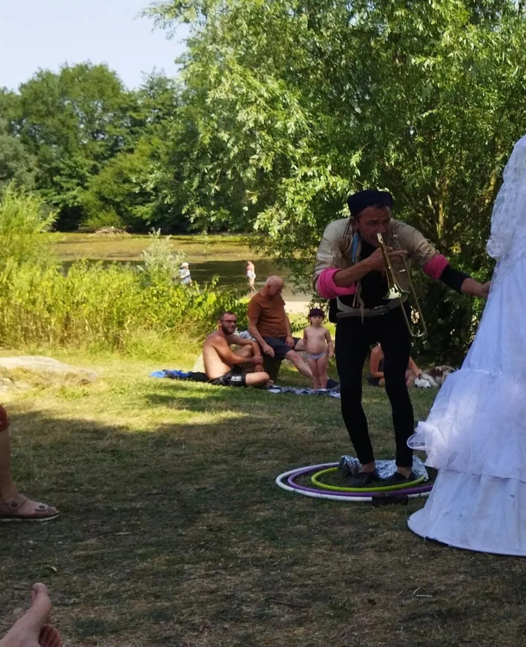 Cette prestation de théâtre de rue avait lieu dans le cadre du festival L’île en été. La semaine prochaine, pas de spectacle sur l’île : Moulinsart donne rendez-vous aux spectateurs le dimanche 31 juillet, à 16 h pour Les facéties de Jérémy l’artiste, un spectacle de 45 minutes destiné aux enfants, mêlant musique, chansons et jonglage. Jérémy revisite les arts du cirque et du music-hall, pendant un voyage onirique et burlesque.