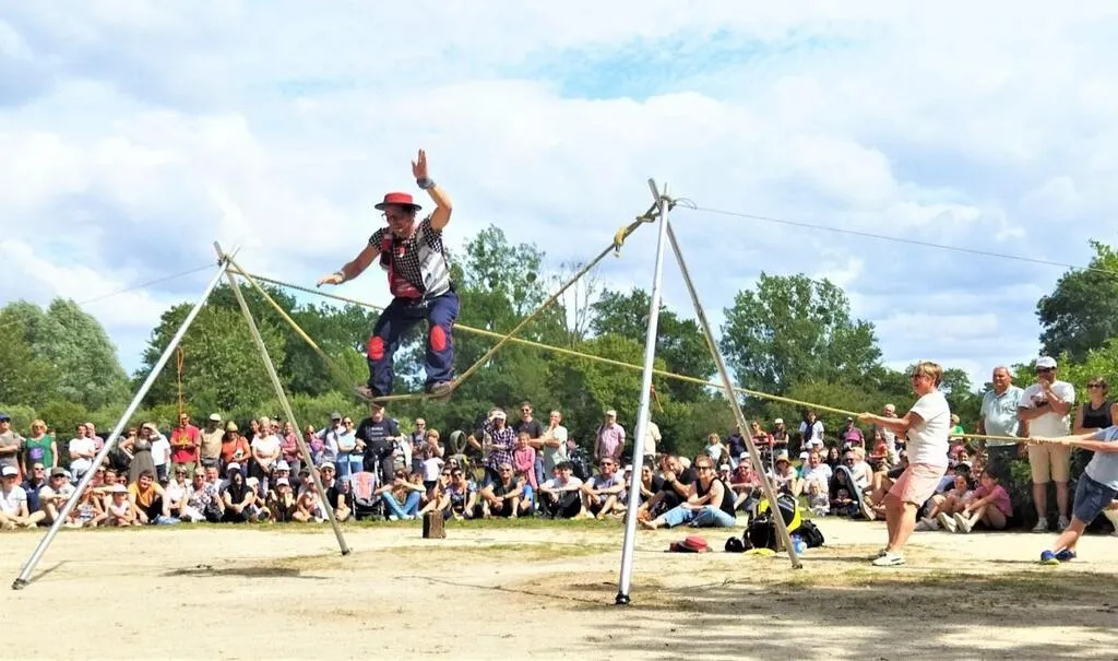 Le clown Mister Banana demande au public de tenir les cordes sur lesquelles il reste en équilibre. © Ouest-France