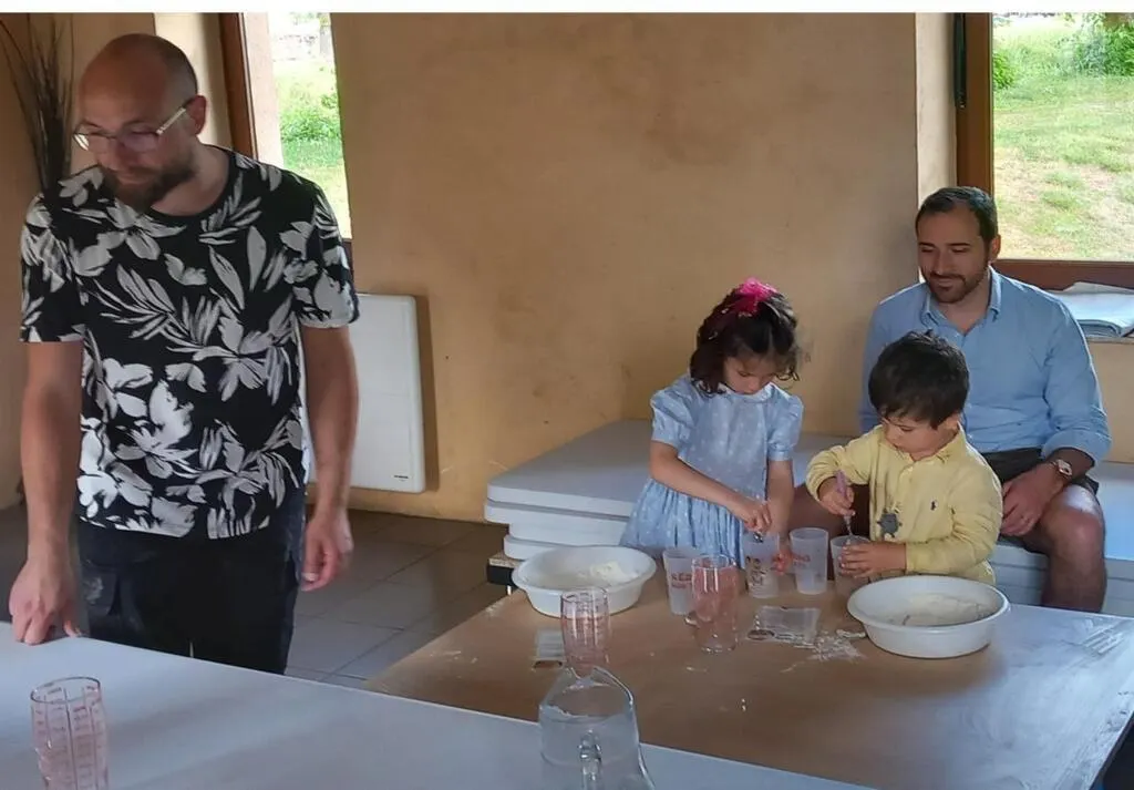 Brune et Aurian mélangent l’eau et la farine sous les yeux de leur papa, avec les conseils avisés d’Alexandre. © Le Maine Libre