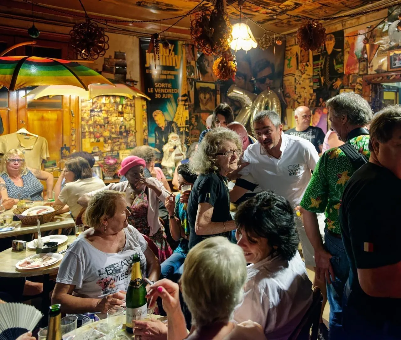 Jeannine Brunet, alias la mère Lapipe, au centre, au milieu des habitués de son troquet, à l’angle de la rue d’Eichthal et de la rue du Colonel-Raynal, au Mans. © Pierrick Bourgault