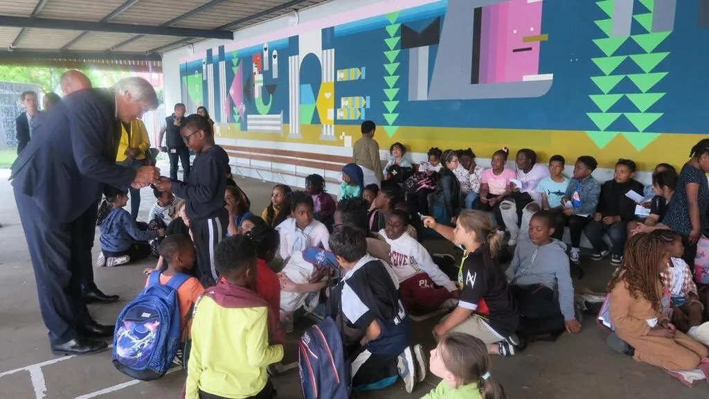 Vendredi 23 mai, Stéphane Le Foll, le maire du Mans s’est plié à la séance d’autographes, sous le préau aux belles couleurs. © Ouest-France