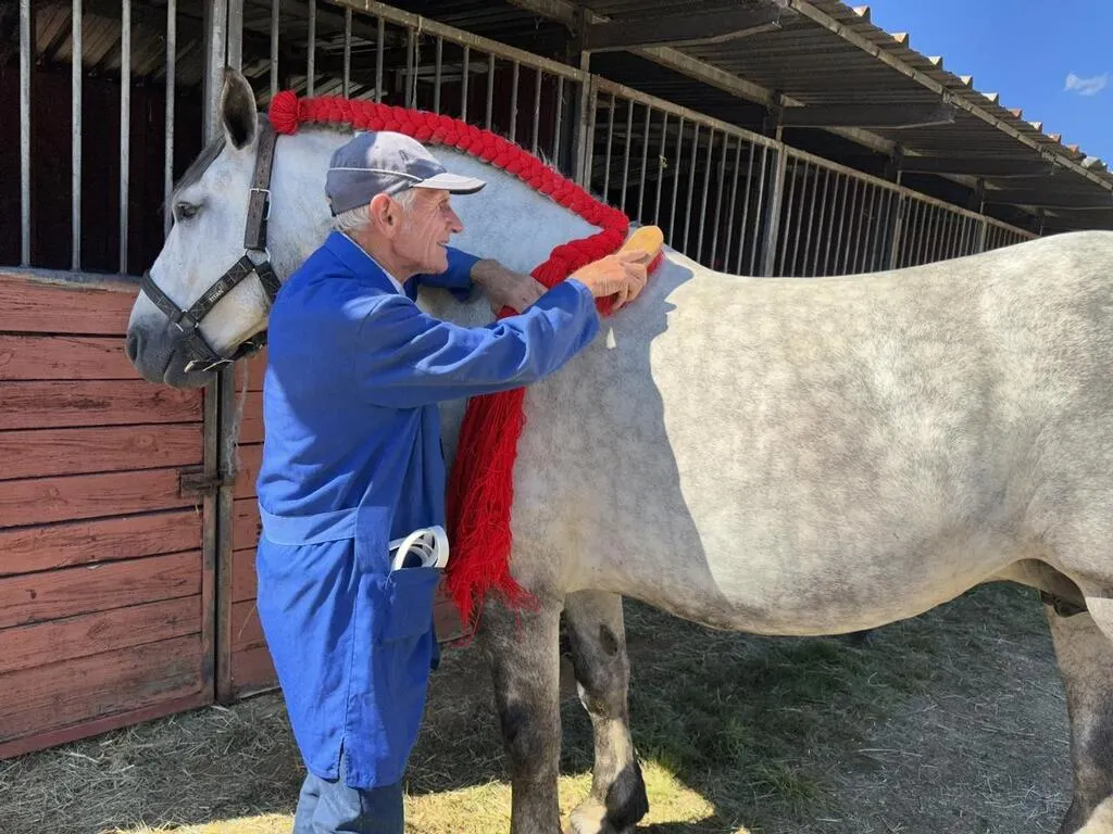 Yves, 71 ans, brosse la robe grise pommelée d’Irena du Greffier, sa jument de race percheronne, à quelques minutes du début de son concours. © Ouest-France