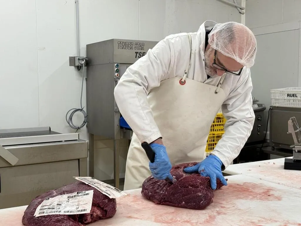 Au sein de l’entreprise Ruel, six bouchers charcutiers travaillent pour préparer les viandes destinées aux collèges. © Archives Ouest-France / Yanne Boloh