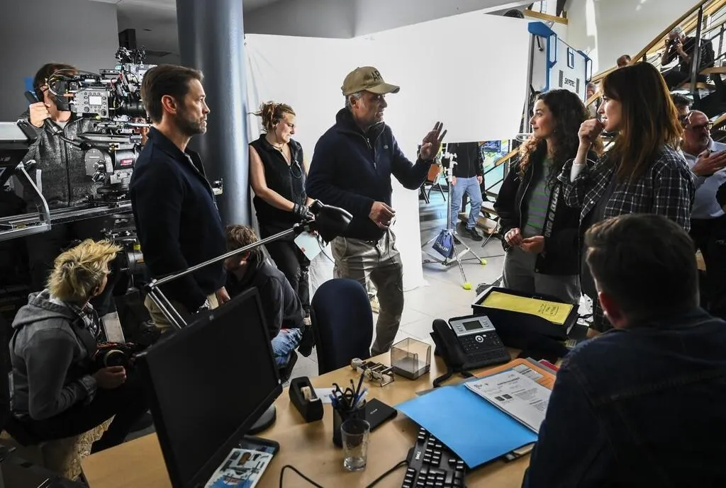 Le Mans, vendredi 21 avril 2023. Philippe Dajoux, le réalisateur à la casquette, donne ses consignes aux acteurs, Jason Priestley, Éléonore Bernheim. © Le Maine Libre – Denis LAMBERT