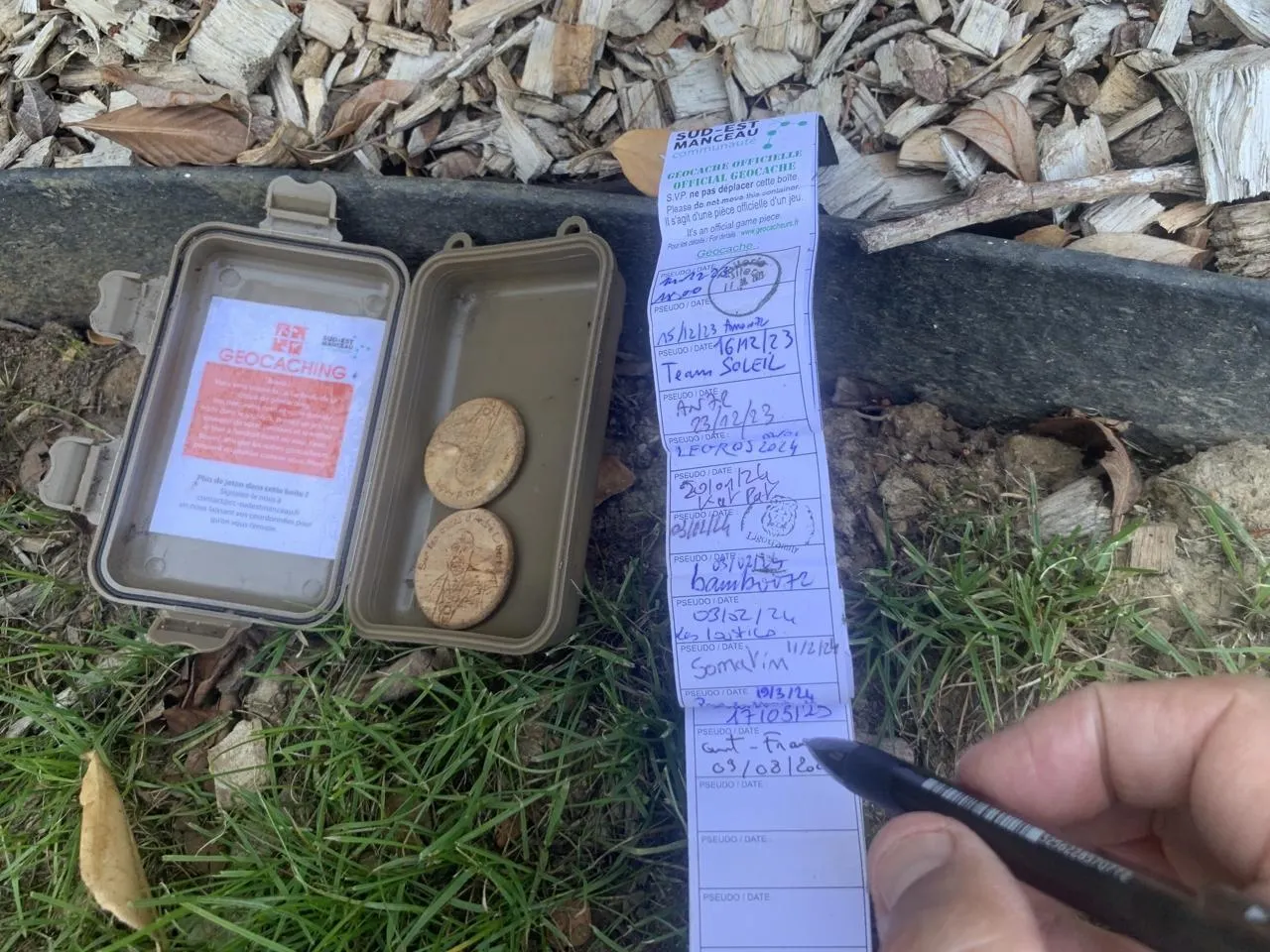 Je rentre les coordonnées de la première cache dans mon application de géolocalisation, elles me dirigent vers la plaine de jeux, je chemine un bon quart d’heure et la trouve facilement. C’est non sans une certaine souplesse que je trouve la boîte, dont je sors la bande papier pour y apposer ma signature. Je réponds à la question en notant ma réponse sur le flyer.