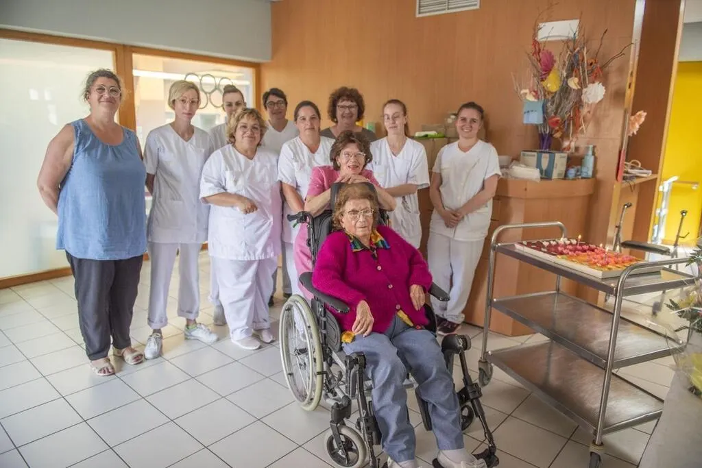 Gilberte Herbaut, entourée de sa fille et du personnel de l’Ehpad, à l’occasion de son anniversaire. © Le Maine Libre