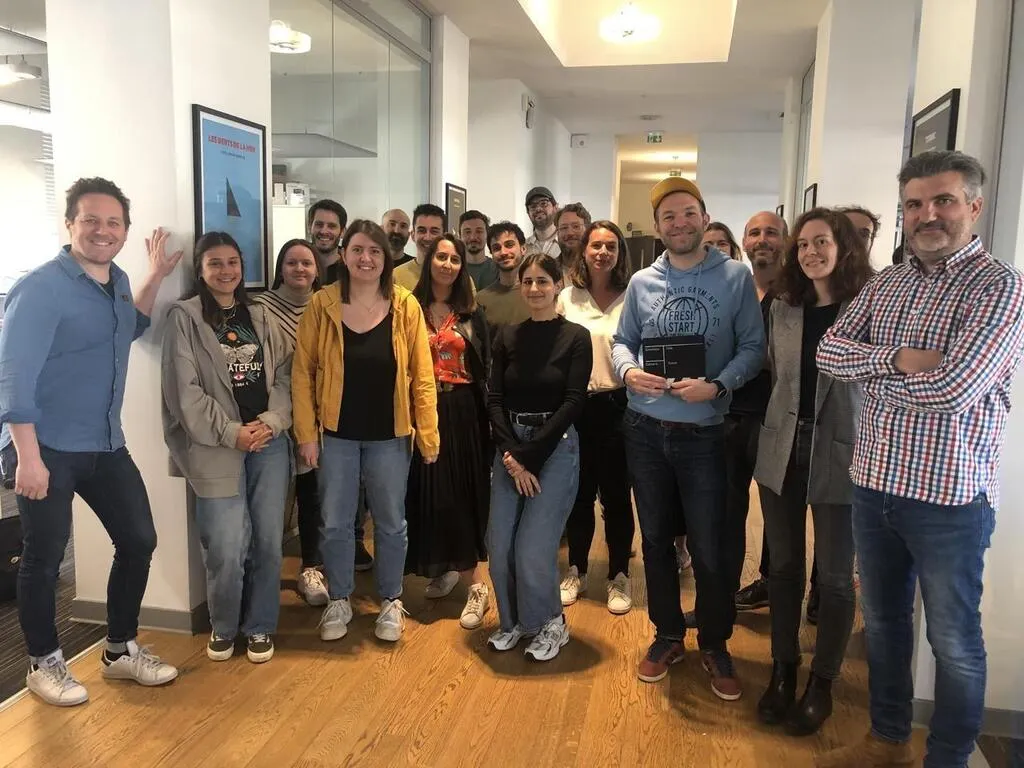 La Cité du film du Mans rassemble une trentaine de professionnels résidents autour des administrateurs fondateurs dont Thierry Bohnke (tout à gauche), Alexandre Barel (tout à droite), Julien Sénéchal (avec la casquette) et la chargée d’accueil des tournages Hortense Girard (à droite). © Photo Le Maine Libre