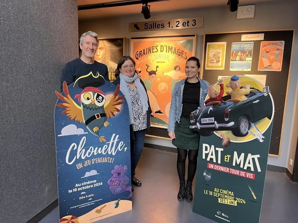 Jean-François Joly, directeur du cinéma, Carine Ménage, adjointe chargée de la culture, et Fantine Roques, du Kid, s’apprêtent à lancer le festival Graines d’images au cinéma, dès le 19 octobre 2024. © Ouest-France.