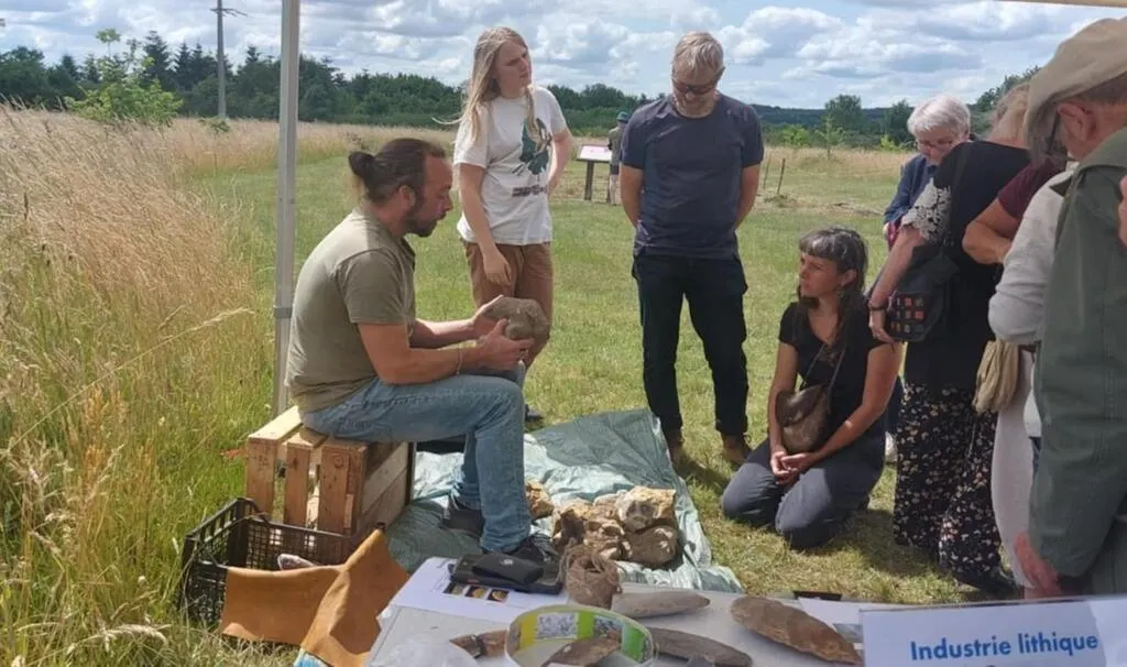 Marco Soisnard, à gauche anime l’atelier de taille de silex, comme cette activité pouvait exister autrefois. © Ouest-France