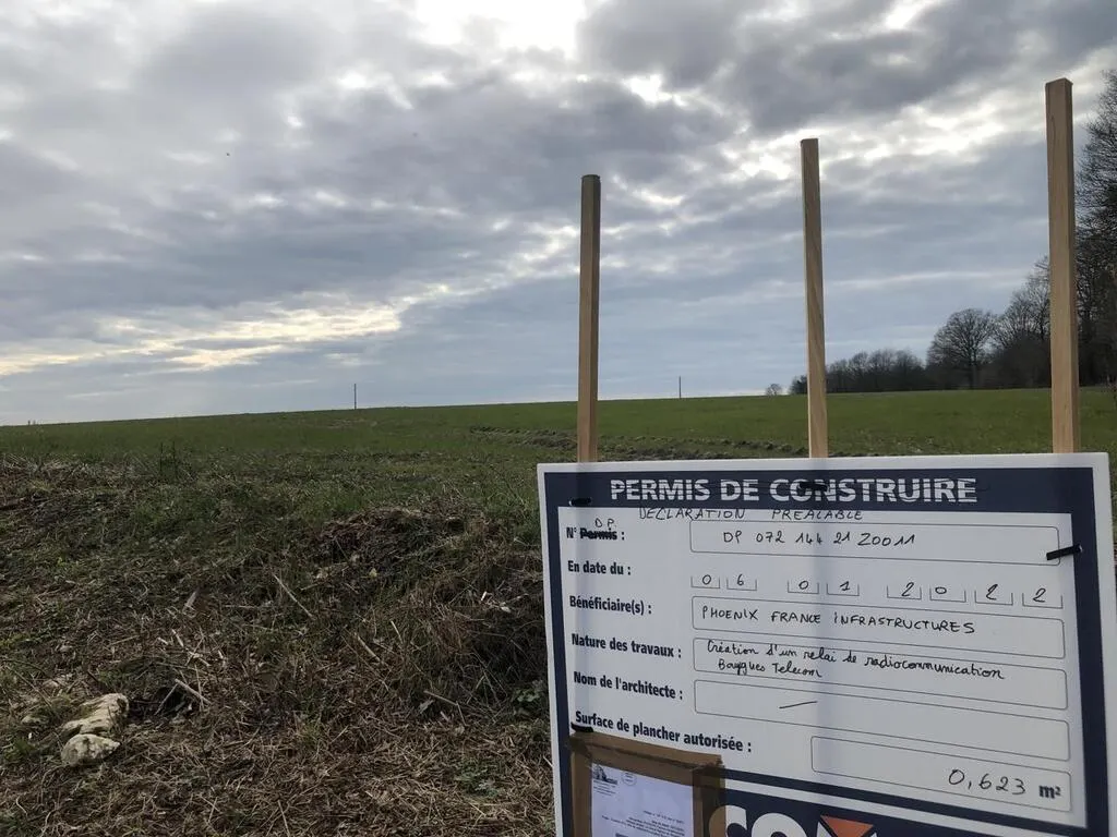 À l’entrée d’un champ au lieu-dit « Grand Sablon du Bousseaux » à Gréez-sur-Roc, une déclaration préalable de travaux annonce la création d’un relais de radiocommunication Bouygues Telecom