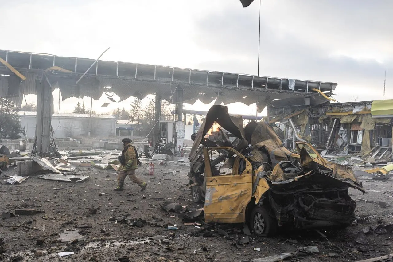 Les pompiers ukrainiens éteignent un incendie dans une station-service, déclenché après avoir été touché par deux drones russes, dans la ville de Kramatorsk, en Ukraine, le lundi 9 février 2026. © Anadolu via AFP