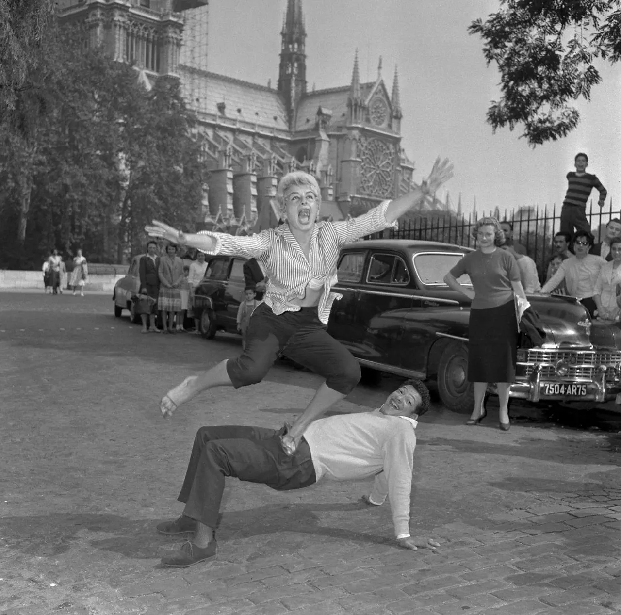 Le chanteur français Henri Salvador, ici avec Mimi Brilli participe à la première démonstration française de Rock and Roll, à Paris, dans la matinée du 20 septembre 1956. Trois mois plus tard, on le danse au Mans : « Le rock’n’roll est à l’an 1956 ce qu’a été le tango en 1912 », écrit alors le journaliste d’Ouest-France. © Archives AFP