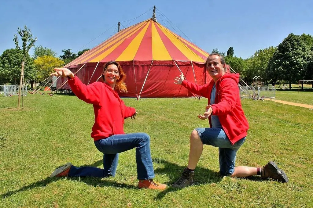 Joséphine Poussier-David et Nicolas David, de la Houlala compagnie, invitent à venir découvrir les premiers spectacles sous leur chapiteau, à partir de ce vendredi 2 juin 2023, à Auvers-le-Hamon. © Ouest-France