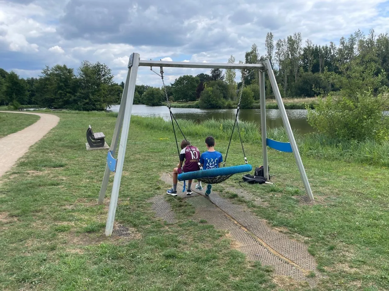 Au bord du cheminement piétonnier du plan d’eau, la municipalité a installé des jeux et autres bancs pour se reposer. © Ouest-France