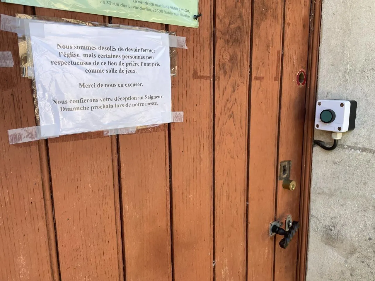 Les bénévoles ont scotché un message et fermé à clé la petite porte de l’église. © Le Maine Libre