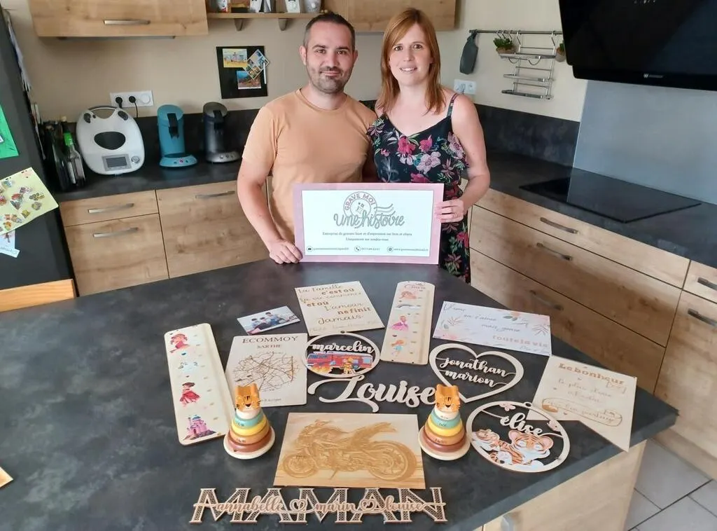 Emmanuel et Alexandrine Fouchard fabriquent eux-mêmes des badges, marque-places, puzzles, jouets, boîtes de rangement… © Le Maine Libre