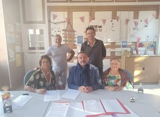 Sophie Portail, Philippe Trotin, Christophe Pinto, Vincent Barrais et Chantal Buin ont signé la convention de partenariat. © Centre social LARES