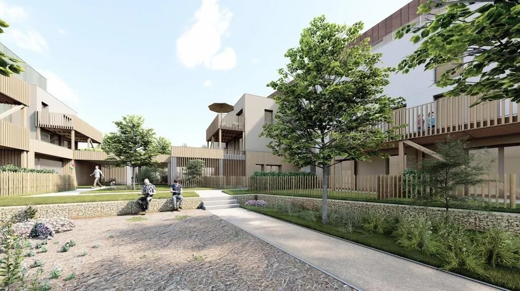 Un visuel aérien depuis la rue de Sarthe de la résidence baptisée Sartora et attendue en 2028 à Sablé-sur-Sarthe. © Clément CHER – Architecte du cabinet THELLIER ARCHITECTES