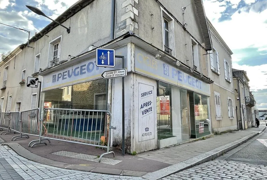 Inoccupé depuis 2022, l’ancien magasin de cycles Peugeot est toujours à vendre, rue Saint-Nicolas, à Sablé-sur-Sarthe. © Ouest-France