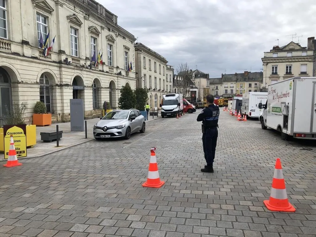 L'accès à la place Raphaël-Élizé restera bloqué jusqu'au au moins midi, ce vendredi 17 mars 2023, à Sablé-sur-Sarthe. Ouest-France